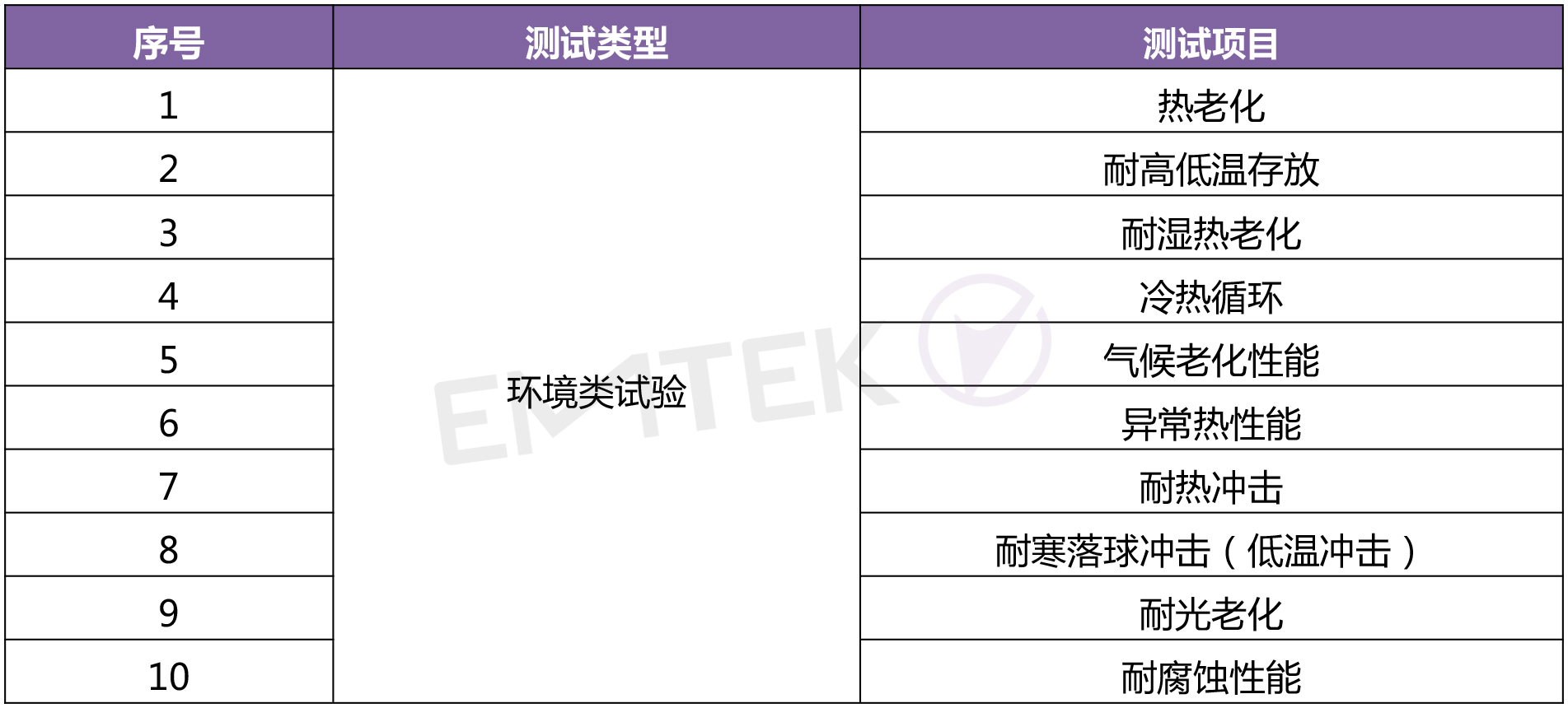 是將產品暴露在自然的或人工的環境條件下經受其作用,以評價產品在實際使用、運輸和貯存的環境條件下的性能,并分析研究環境因素的影響程度,包含的環境試驗如熱老化、低溫存放、冷熱循環、耐寒落球沖擊、耐光老化等;