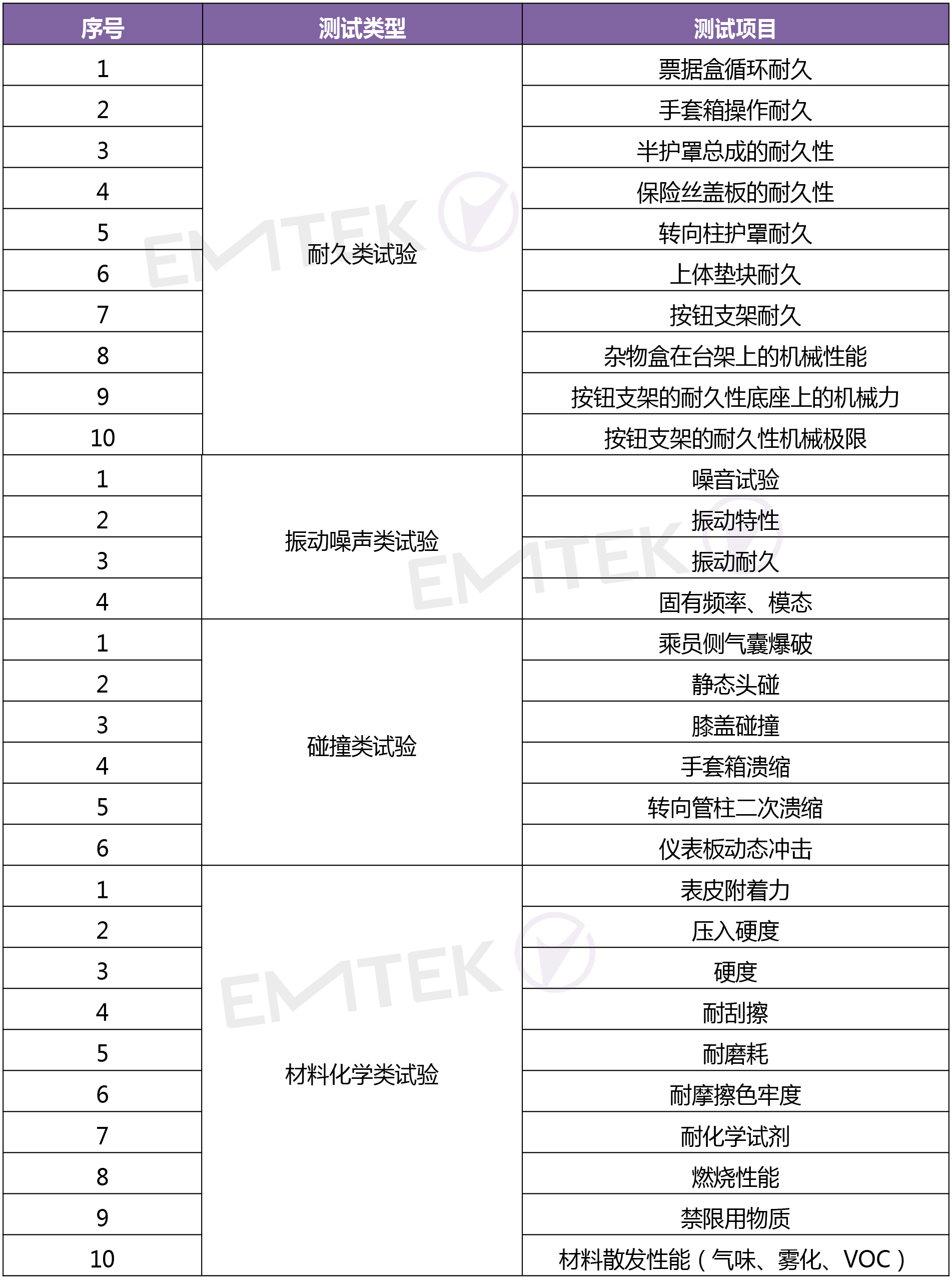 考核儀表板材料化學性能,比如壓入硬度、耐磨、表皮附著力、剝離強度、耐化學試劑、氣味、霧化、VOC等。
