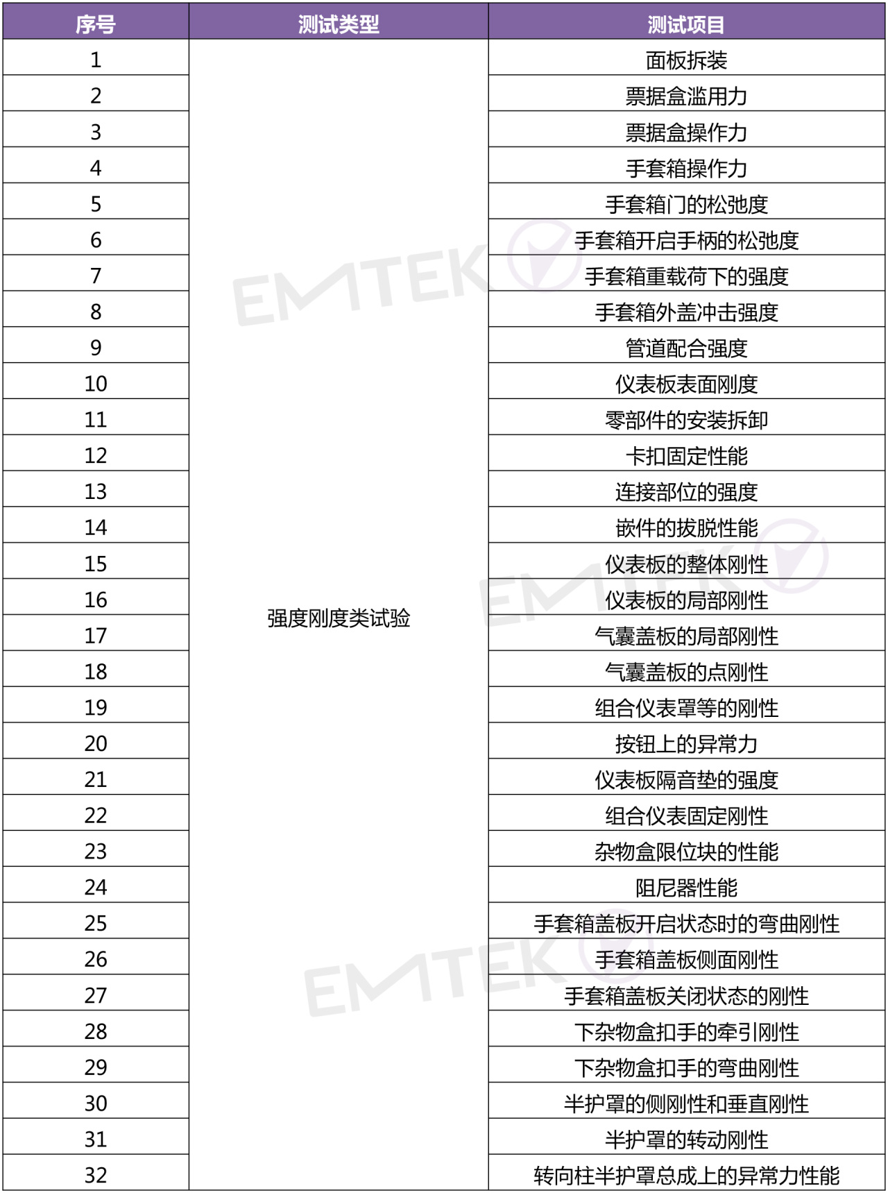 考核儀表板使用過程中承受的強度和剛性、操作功能特性及耐久、振動試驗、碰撞試驗,比如票據盒循環耐久、手套箱操作耐久、儀表板整體剛度、局部剛性/點剛性、手套箱門剛度、振動特性、振動耐久、模態、靜態頭碰/膝碰、乘員側氣囊爆破等;