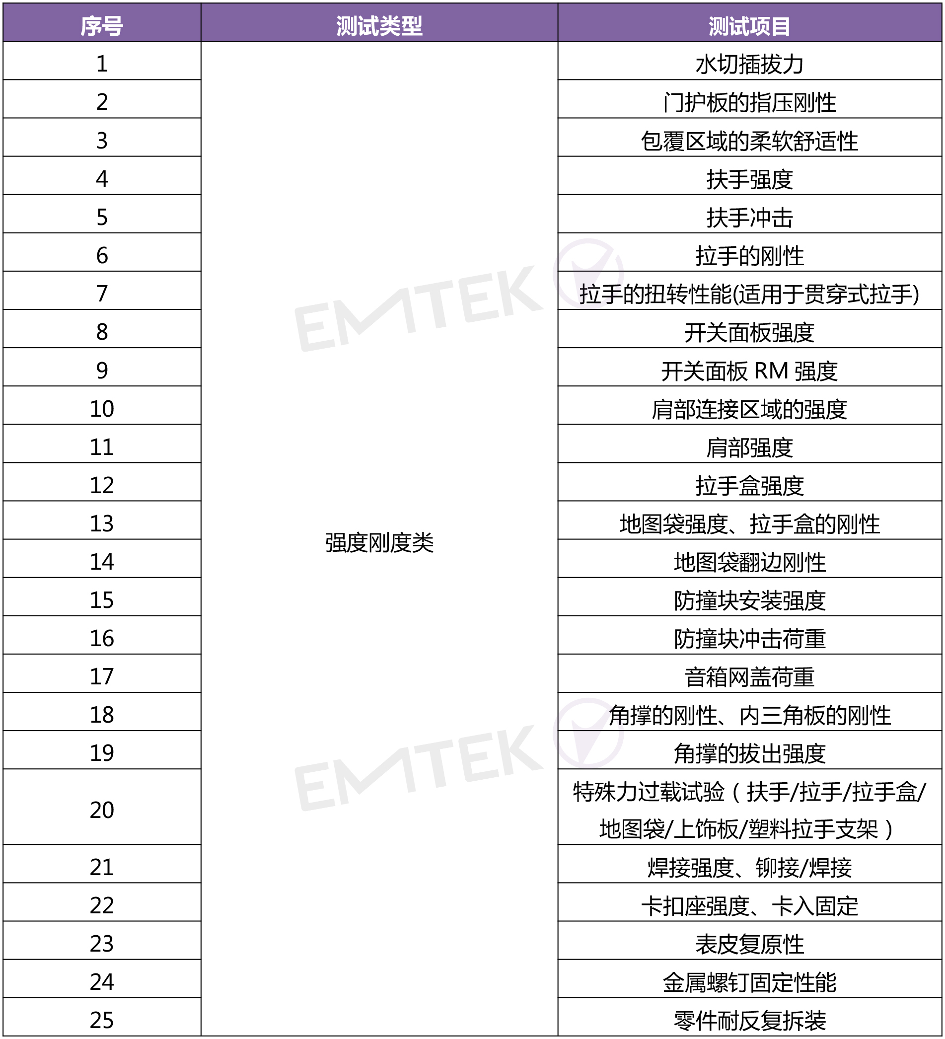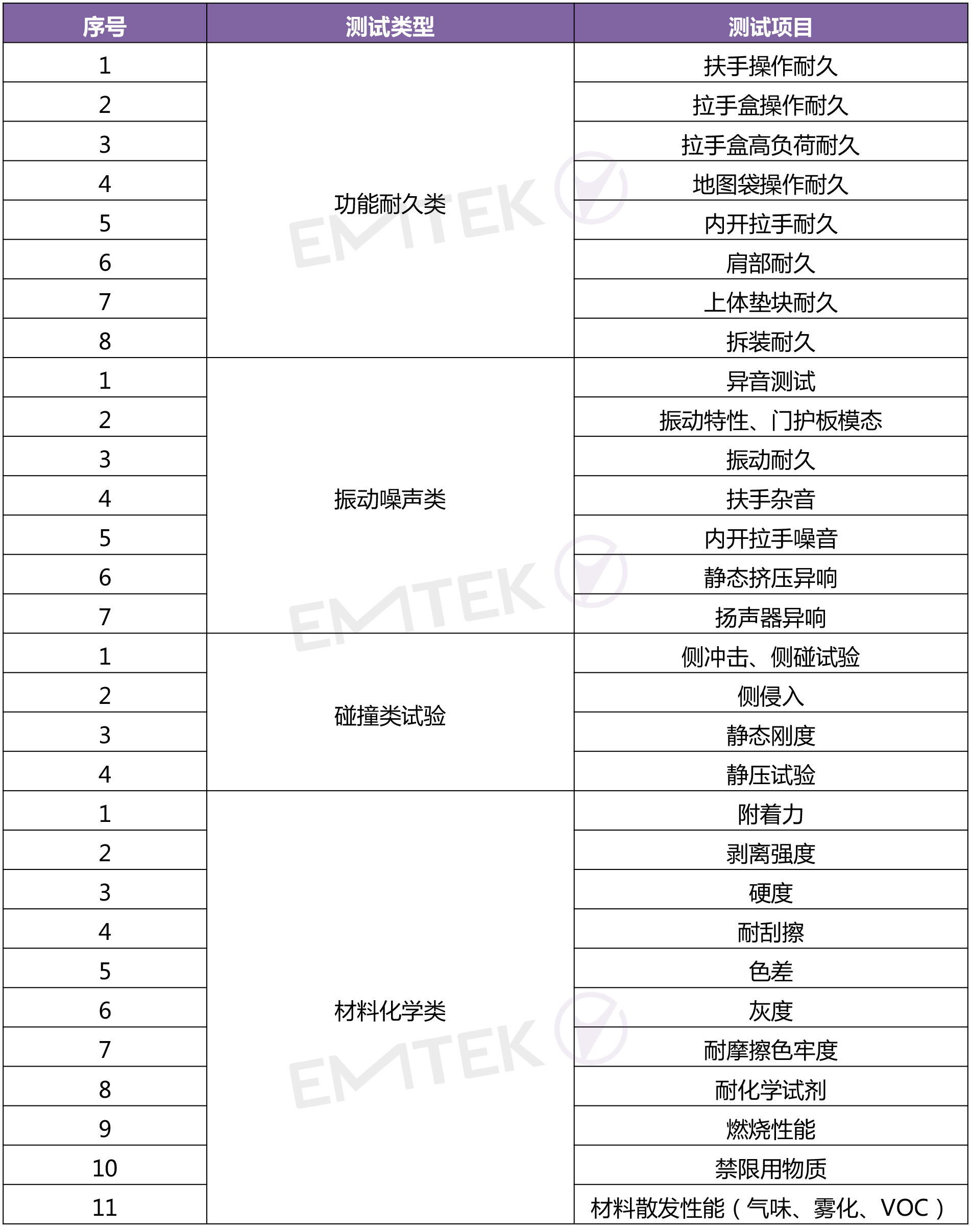 考核門板使用過程中承受的強度和剛性、操作功能特性及耐久、振動試驗、碰撞試驗(零件在突發事故中對乘員保護的能力),比如內開拉手耐久、拉手盒耐久、地圖袋強度、扶手強度、拉手盒強度、振動特性、振動耐久、側沖擊、側侵入等;