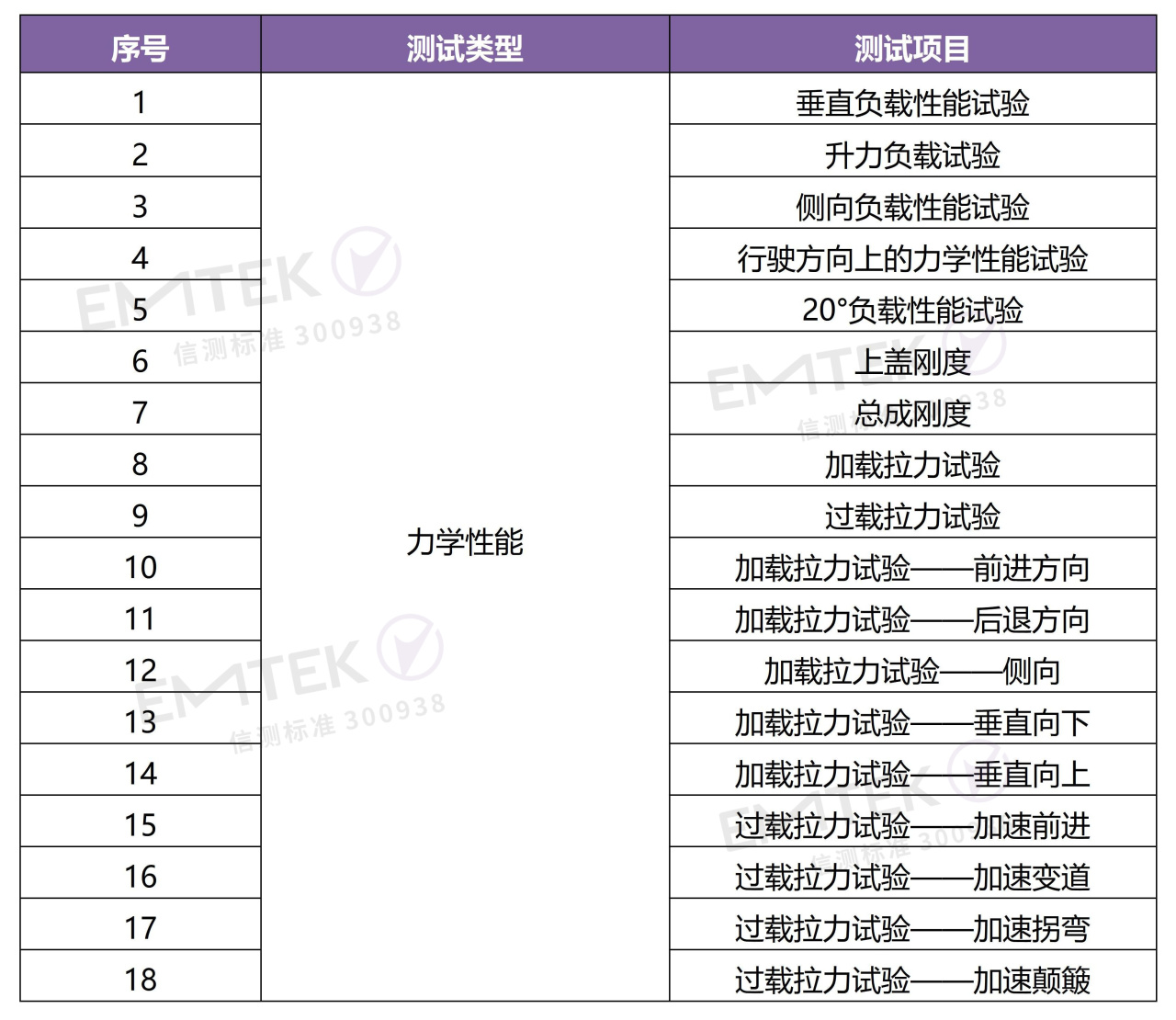 垂直負載性能試驗,升力負載試驗,側向負載性能試驗,行駛方向上的力學性能試驗,20°負載性能試驗等;
