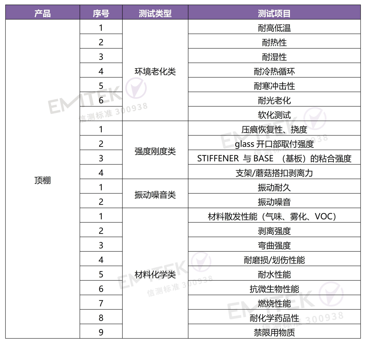 頂棚內飾是汽車整車內飾的重要組成部分,它的主要作用是提高車內的裝飾性,同時還可提高與車外的隔熱、絕熱效果;降低車內噪聲,提高吸音效果;提高乘員乘坐的舒適性和安全性。由于太陽直射車頂,汽車頂部溫度較高,因此頂棚內飾的耐熱性和耐候性指標要求較嚴。