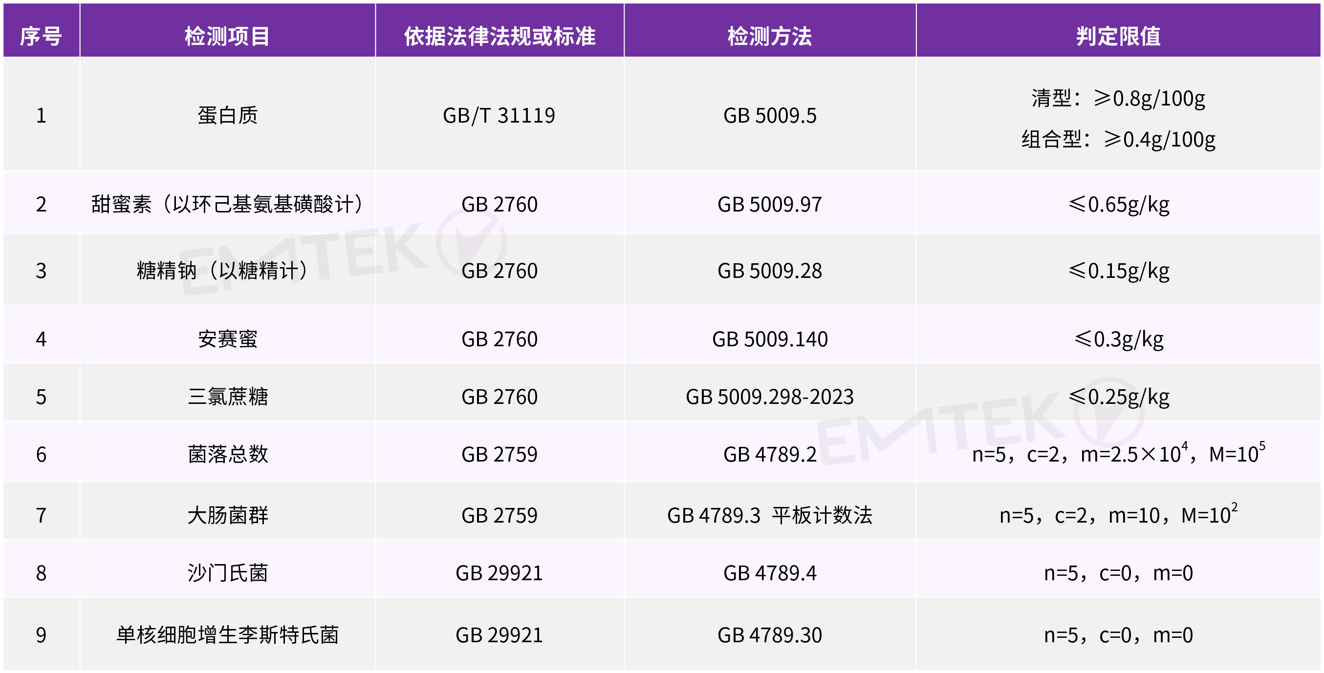 雪糕在《2024年全國食品安全監督抽檢實施細則》中被劃分到冷凍飲品一類。參照的產品標準有GB/T 31119-2014《冷凍飲品 雪糕》和GB 2759-2015 《食品安全國家標準 冷凍飲品和制作料》,檢測項目和檢測限值見下表。