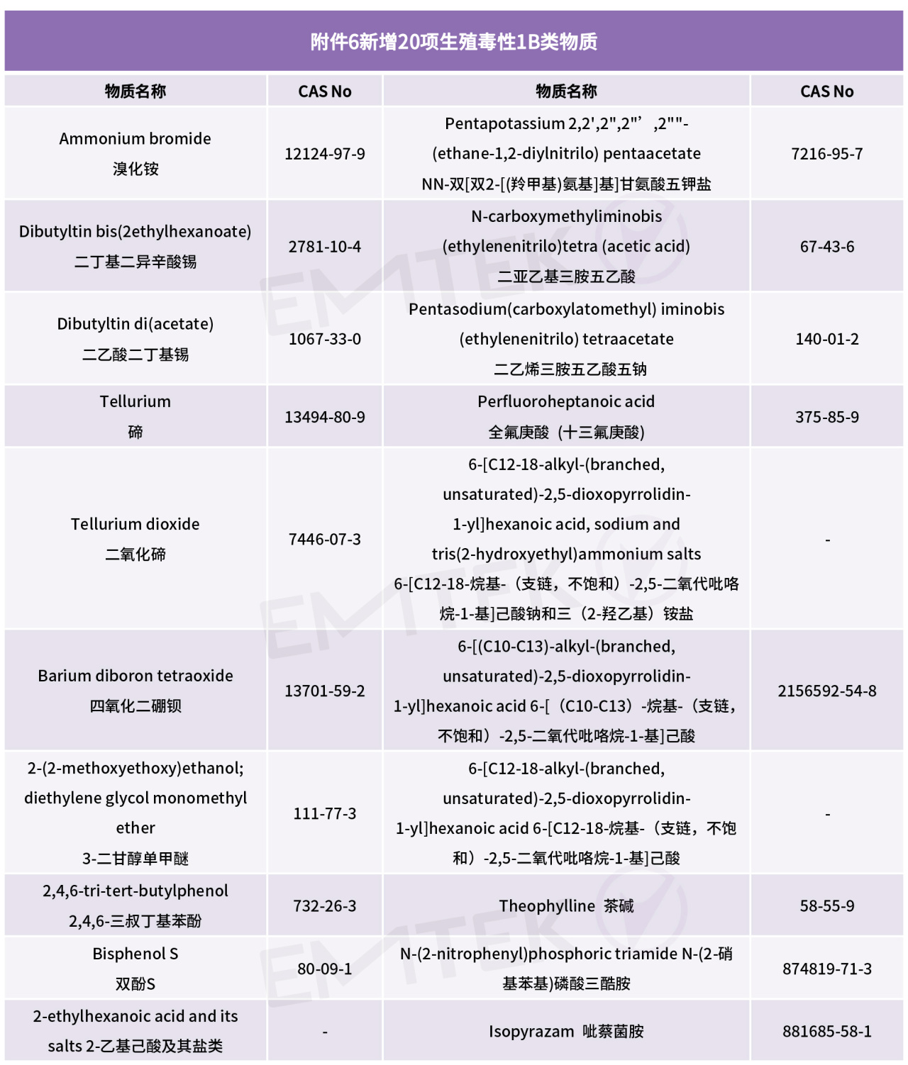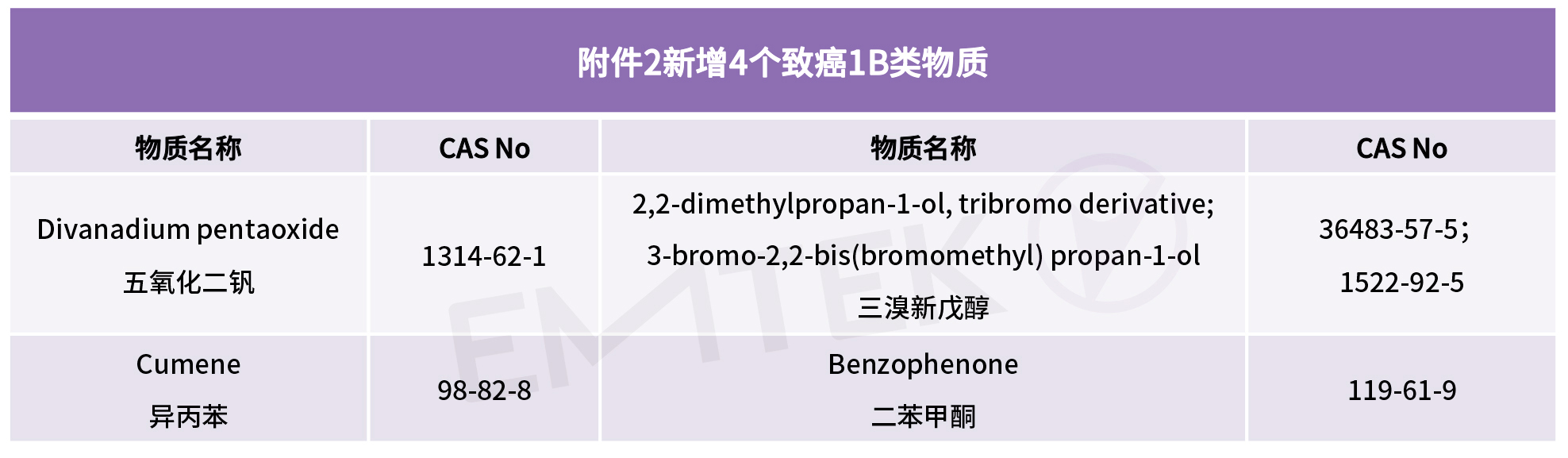 此次修訂,新增24項CMR物質,新增物質將于2023年12月1號生效,同時,針對之前的5項CMR物質信息進行了更新,具體新增物質如下:
