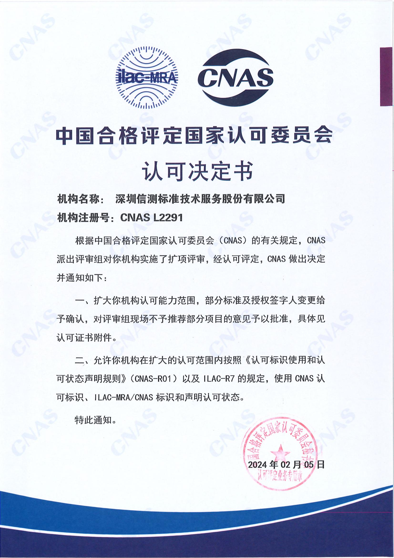 2024年2月5日,深圳信測標準技術服務股份有限公司順利獲得新能源場站和儲能電站檢測標準和判定標準的CNAS資質,在光伏電站、風電場/風電機組、儲能的外場檢測項目上擴充了新能力。本次CNAS擴項認可范圍共覆蓋4類別28份標準61項測試能力。