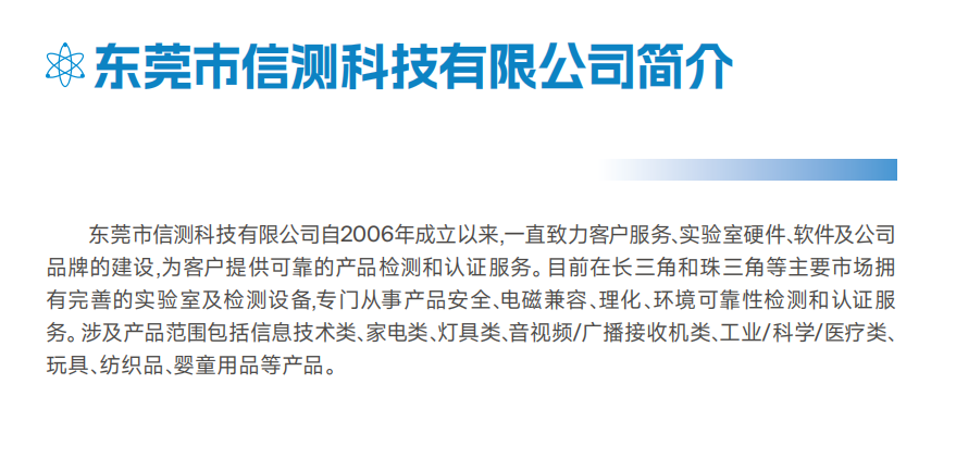 實驗室總面積8000平方米,擁有可靠性檢測中心、玩具檢測中心,燈具檢測中心,電池檢測中心,鞋材與紡織品檢測中心,汽車電子檢測中心,音視頻產(chǎn)品檢測中心,信息技術(shù)設(shè)備檢測中心,電源檢測中心,EMC/RF檢測中心共10個專業(yè)檢測中心,檢測基地已有專業(yè)成套檢驗檢測設(shè)備1200套,獲得了CNAS,CMA,A2LA,F(xiàn)CC等權(quán)威機構(gòu)的認可,能夠為電子電氣產(chǎn)品,日用消費品,汽車電子產(chǎn)品提供一站式的產(chǎn)品全生命周期的測試認證服務(wù)解決方案。