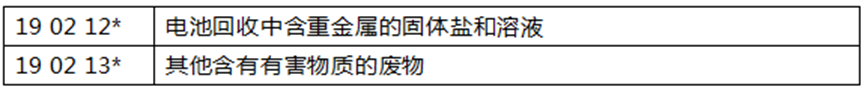 (4)關于 19 02 廢物物理/化學處理(包括脫鉻、脫氰、中和)產生的廢物新增了電池回收中含重金屬的固體鹽和溶液等。條目 19 02 11*已刪除,插入以下條目: