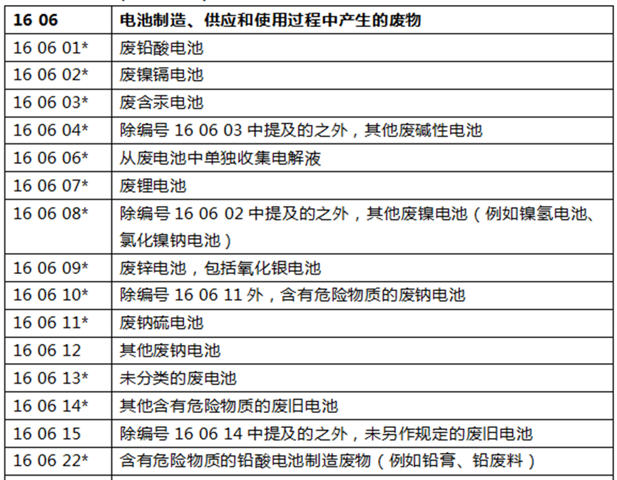 (3)關于 16 06 電池和蓄電池,將“電池和蓄電池”改為“電池制造、供應和使用過程中產生的廢物”,同時將原來的 6 種物質擴展到 35 種,且多為危險廢物。其中廢鋰電池、廢鋅電池、廢鈉電池均被列為危險廢物。替換內容如下(部分示例):