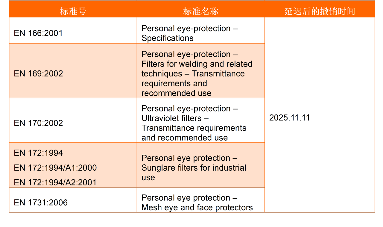 按實施決定(EU)2023/941,舊版本的協(xié)調標準原計劃在 2024 年 11 月被撤銷。由于新標準提出了較多新的技術要求,為給制造商足夠的時間調整,實施決定(EU)2024/2599 對部分協(xié)調標準的撤銷日期進行延遲,其中包括 EN 166、EN 169、EN 170、EN 172 和 EN 379 等關于眼部和面部防護的標準。意味著制造商將有1年額外的時間來適應新的標準,并可以在 2025 年 11 月前依然按照舊版標準的相關要求進行產品型式測試并申請 CE 認證。